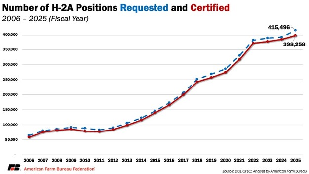 The H-2A guestworker program continued to expand in fiscal year 2025, with 13,358 more positions certified than in fiscal year 2024. For the first time since the program's inception, certified demand approached 400,000 positions, reflecting ongoing labour constraints in U.S. agriculture.