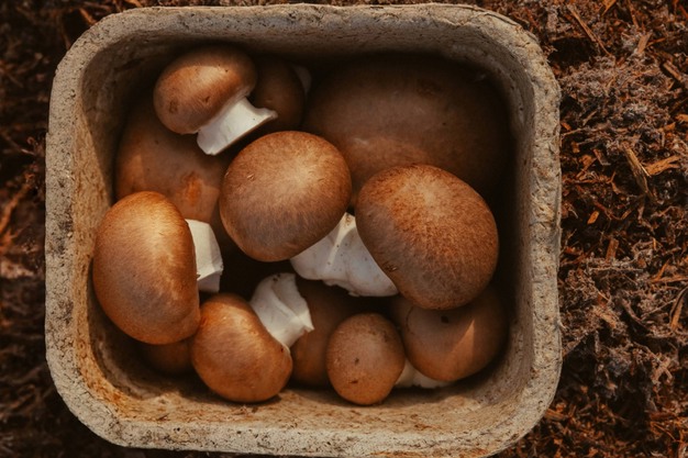 "Mushrooms packed in the nutrient medium they were grown on"