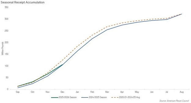 Season-to-date receipts through December reached 106.2 million pounds, largely in line with the previous year at 104.8 million, but 15 per cent below the five-year September to December average of 124.7 million. Improved pecans represented 90 per cent of receipts, native pecans 3 per cent, and substandard material 7 per cent.
