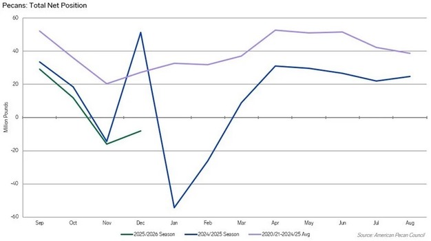 The American Pecan Council released its December 2025 shipment report, covering the fourth month of the 2025/26 marketing year. Volumes are reported on an in-shell equivalent basis, with kernel weights normalized using a 2.0x conversion factor.