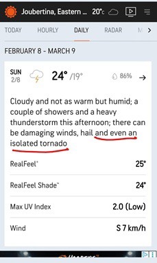 Right: a tornado warning for Joubertina, Langkloof, issued after last week's tornado
