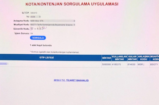 Most of Egypt's date export quota to Türkiye for 2026 has been reached in just six weeks. Under the free trade agreement between Egypt and Türkiye, a quota of 5,000 tonnes of dates can be exported each year. A check of Turkish Ministry of Trade figures on February 12 shows that only 814 tonnes remain of the annual quota of 5,000 tonnes, meaning that 83.72% of the quota is already exhausted.