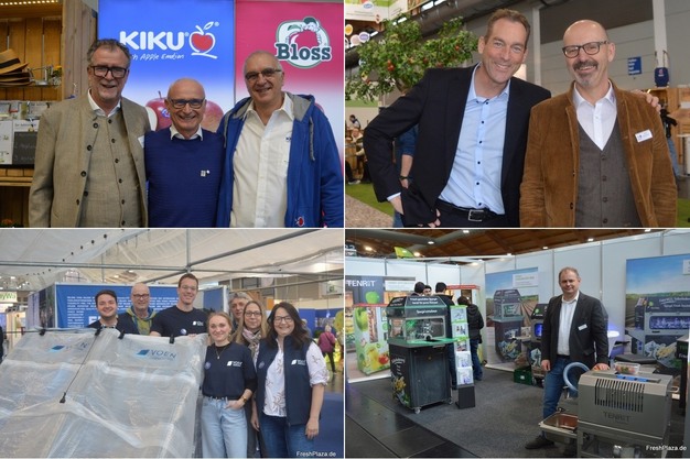 Exhibitors at this year's Fruchtwelt Bodensee. Clockwise: Jürgen Braun from Adema with partners from SalemFrucht and Seefrucht GmbH, OvB CEO Tim Strübing with Erich Röhrenbach, Chairman of Obstregion Bodensee e. V., first-time exhibitor Sascha Wietbrauk from Tenrit GmbH, and the team from VOEN Vöhringer.