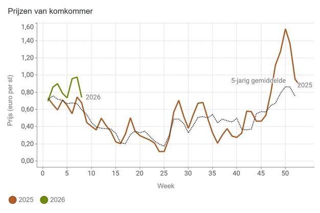 Cucumber prices remained above last year's level, although they declined compared to week 7 (link in Dutch). The average price stood at €0.74 per piece in week 8.
