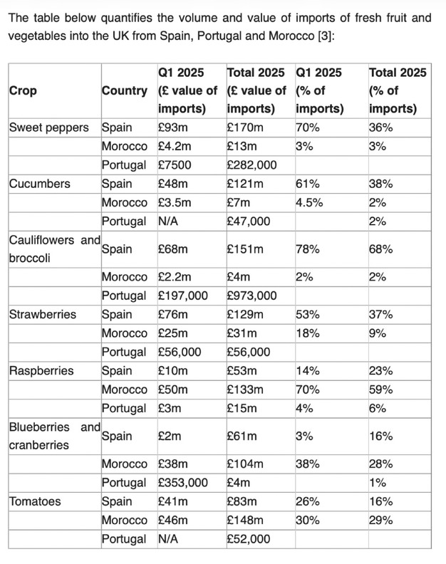 Redmond-King said that two-fifths of the UK's food is imported, and last year imports from Spain, Portugal, and Morocco totalled £5.4 billion. Among the top 30 food imports were more than £500 million of tomatoes, sweet peppers, and cucumbers, and nearly £500 million of strawberries, raspberries, and other berries. Imports also included more than £150 million of cauliflowers and broccoli. These products are typically not grown in the UK at this time of year, resulting in seasonal dependence on overseas supply.