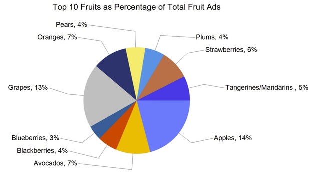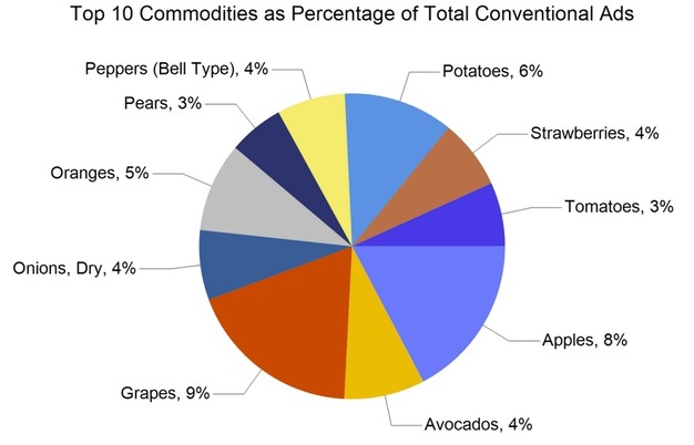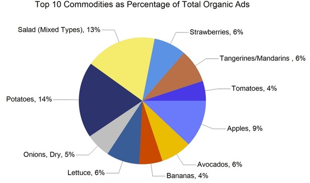 Ads by commodity group were as follows: fruit 169,874 (60%), onions and potatoes 29,085 (10%), vegetables 77,817 (27%), herbs 1,265, ornamentals 3,600, hemp 578, and honey 2,472. Organic produce accounted for 29,874 ads, representing 11% of the total.