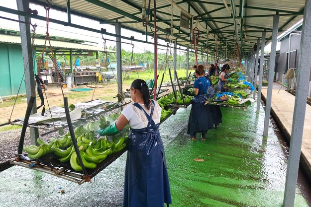 The banana bunches are not transported to the packing center hanging from hooks on a rail; instead, they are cut directly into hands in the field and carried on stretchers to the packing station. The latex already drains during the journey, so at the packing station, only a small additional rinse is needed, without any need for water pools. The water savings are considerable. This system, developed by Varcli itself, is unique in its kind. Banana growers interested can contact the company for more information.