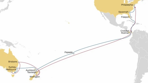 The service rotation includes Philadelphia, Savannah, Freeport, Rodman, Papeete, Auckland, Sydney, Melbourne, Brisbane, Wellington, Tauranga, Cristobal, and returns to Philadelphia.