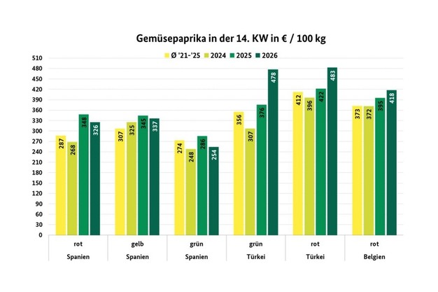 According to the German BLE, prices for Spanish, Dutch, and Belgian products often trended downward, though they were also higher on some days, which led to noticeable buyer hesitation in Hamburg. In Munich, retailers attempted to reduce inventories of Spanish products by offering discounts. Red domestic pointed peppers cost €8.00 and block peppers €7.00 per kg in Frankfurt. In Munich, the German season kicked off with the first green pods.
