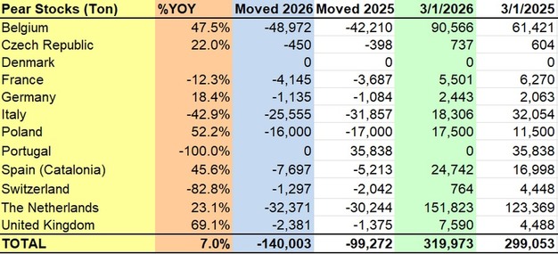 Pear stocks in Europe rose by 7.0 per cent year-on-year, reaching 319,973 tons as of 1 March 2026, compared to 299,053 tons in 2025.