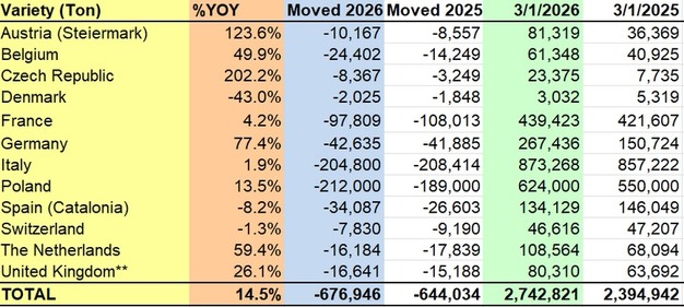 The Netherlands reported 108,564 tons, up from 68,094 tons, while Belgium increased to 61,348 tons from 40,925 tons. Austria (Steiermark) rose to 81,319 tons from 36,369 tons, and the Czech Republic rose to 23,375 tons from 7,735 tons.