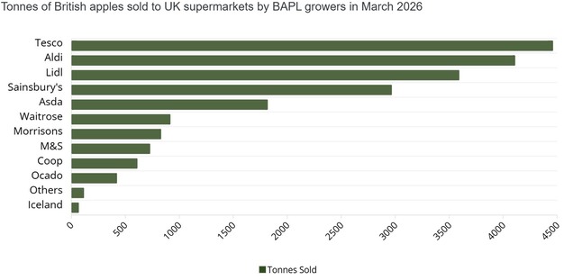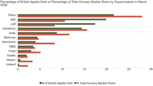 UK supermarket sales of British apples in March 2026 show clear differences between retail market share and sourcing patterns, with discounters continuing to over-index on domestic supply.