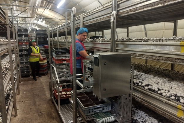 The machine cuts the stalks, places the mushrooms in the punnet with the correct presentation, and at the same time, weighs the punnet. All the picker has to do is pick the mushroom and place it on the belt, so instead of using one hand to pick and one to cut, the picker can use two hands to pick, which increases their speed while also reducing the tasks they have to do.