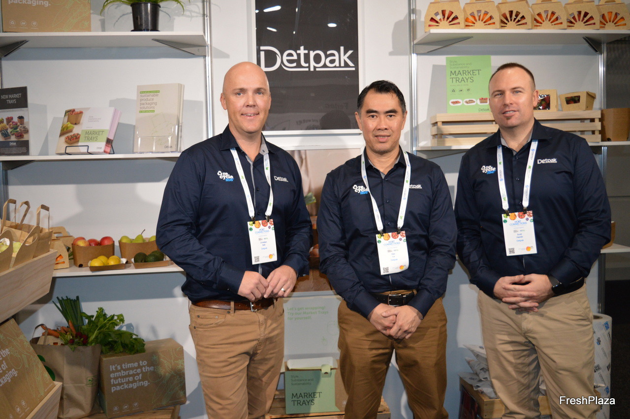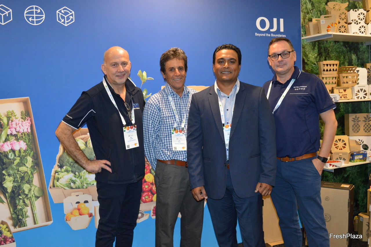 OJI Fibre Solutions are removing plastic from the supply chain with a range of trays and cartons. The company has its own mills in New Zealand from where they ship rolls of carton into Australia. Mark Hussein, Sheehan Pera and Jason Cairns-Lawrence.