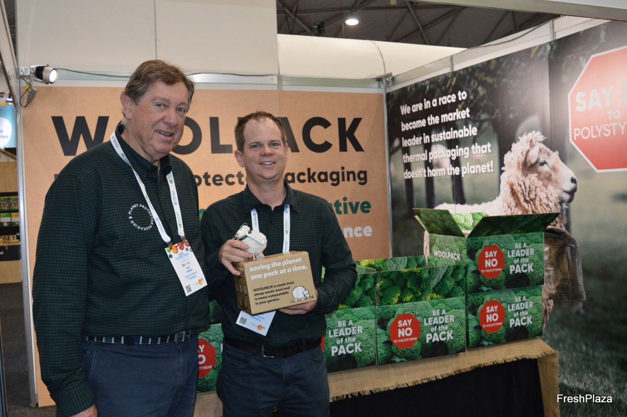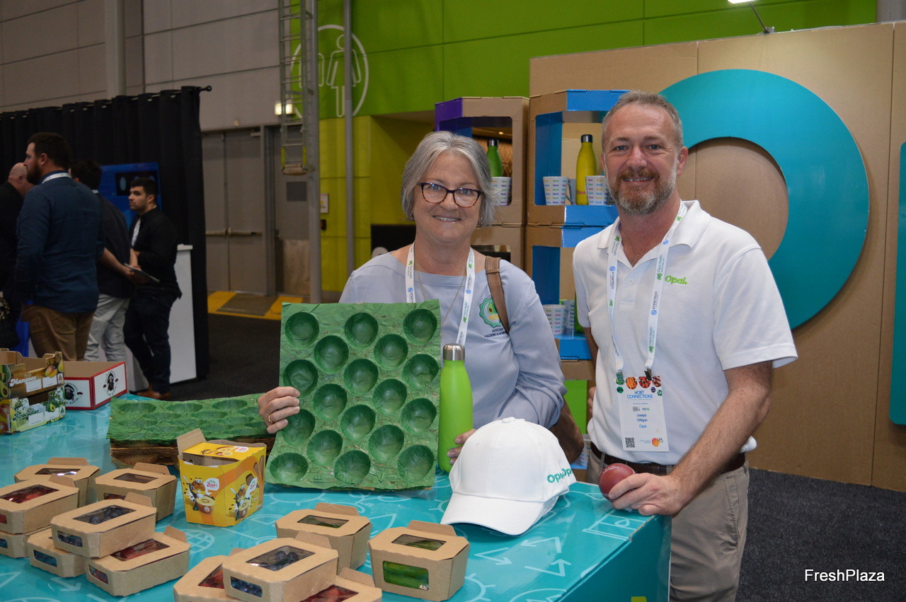 Avocado grower Alison Tolson from Avorama with Joe Gilligan from Opal. Opal is a packaging company with produces paper liners for avocados and mangoes which are now a requirement from the retailers in Australia, they also do a variety of other packaging.