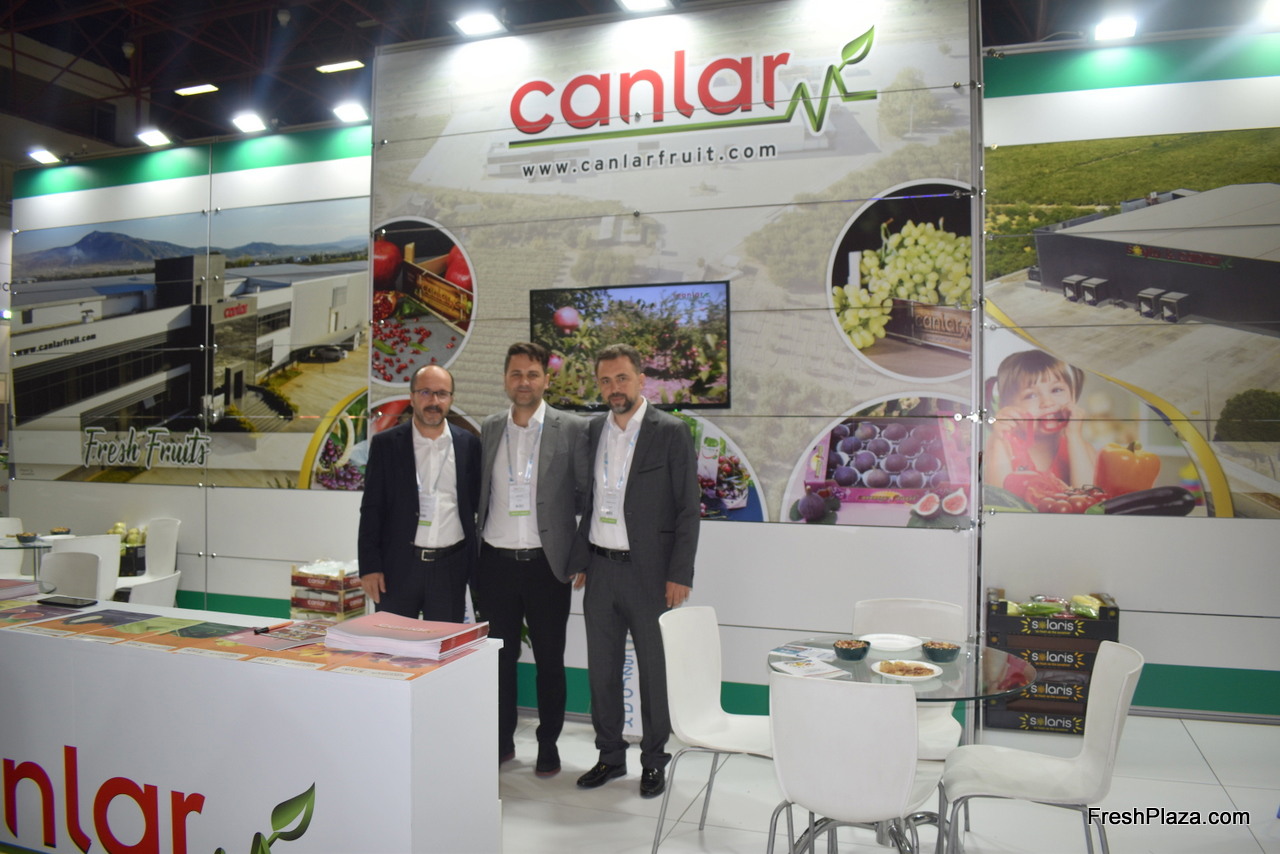 Ersin Aydin, Sefik Can and Mehmet Ali Can at the Canlar Fruit stand. Aydin works for HC Agriculture, which is related to Canlar and focuses on the Asian market mostly. They were very happy with the event and Sefik told us Canlar has just finished a new storing facility with 45 cold rooms, which can store 100 tons of fruit each.