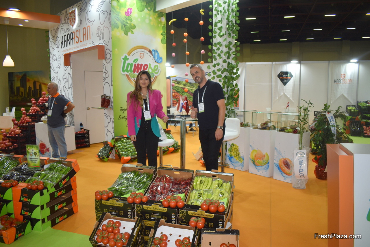 Sumeyye Karaaslan and Güngör Karaaslan, representing both Karaaslan and Fresh Diamond. Fresh Diamond imports the produce to the Netherlands to sell it on from there. They deal in pomegranates, peppers, tomatoes, Sultana grapes as well as pears, among other produce. They export to the Netherlands, Germany, Belgium and Sweden.