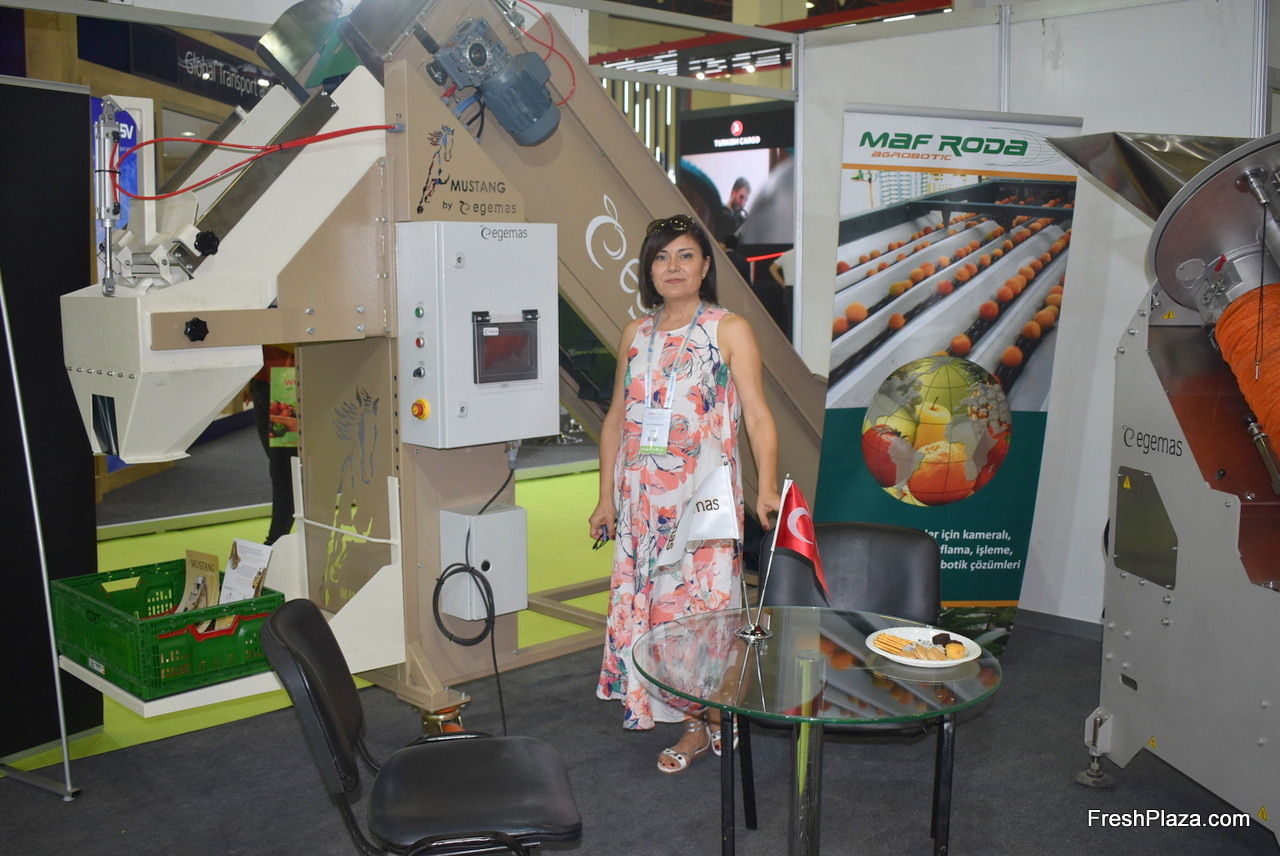 Bilge Bakirsever of Egemas. They add automation to machinery, like fruit sizers. Their solutions help apples, citrus, fig and pear exporters to remove the need for manual labor. They sell their solutions in the Turkish market, but also would like to expand in North Africa and Singapore. On the photo is a netting machine for onions and potatoes.