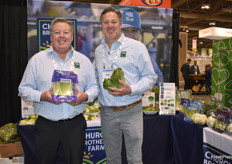 Brian Bengard and Ernst van Eeghen with Church Brothers Farms show whole leaf Romaine and Tuscan Baby Romaine lettuce.