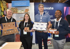 Team WestRock shows different types of packaging. From left to right: Michael McLeod showing WetTech corrugated, Kimberly Wetter showing a carton apple carrier, Andrew Freeman shows carton primary package and corrugated master shipper and Jaylen Ponder shows a topseal tomato punnet.