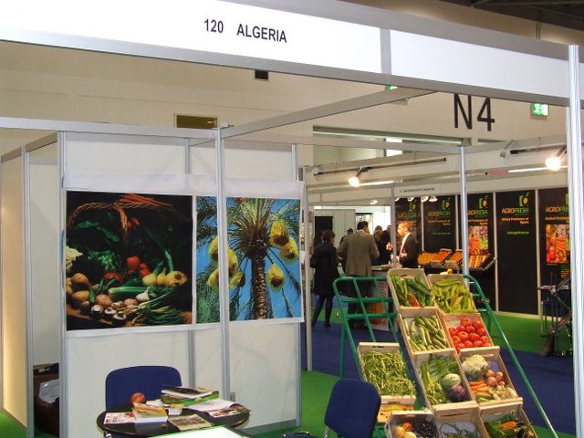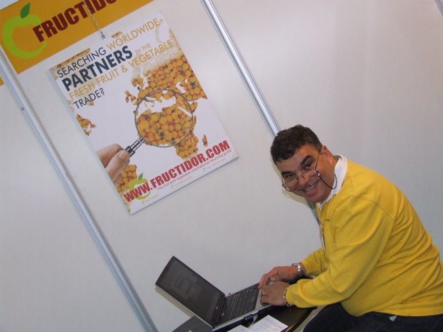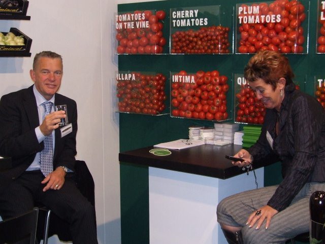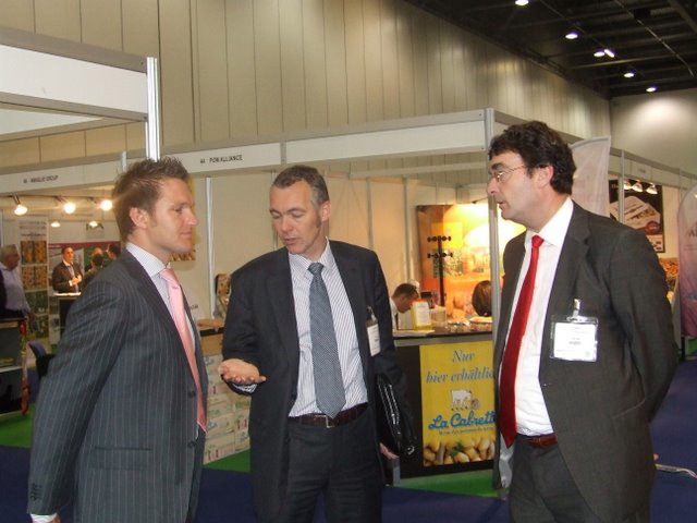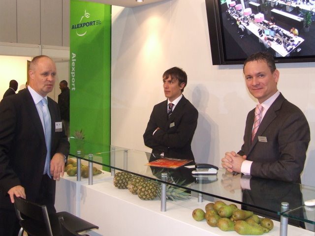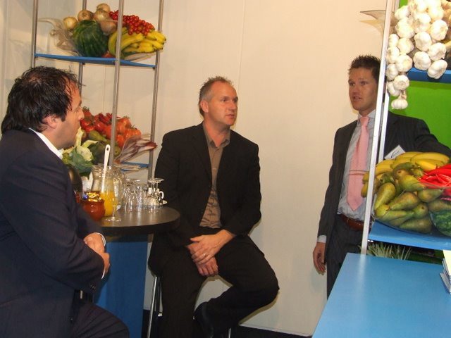 David Crossland formerly UK general manager of Arava export growers and now Managing director of Mill Associates visiting the Royal Pom booth. Royal Pom is represented by Mr. Elshad Shirin and Rashad Shirin.