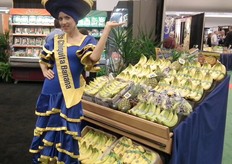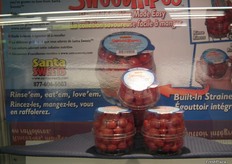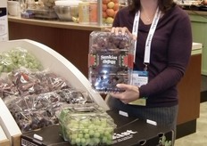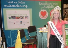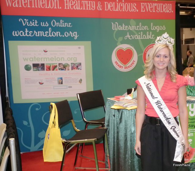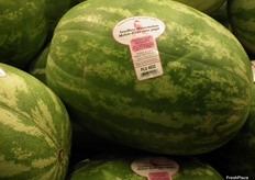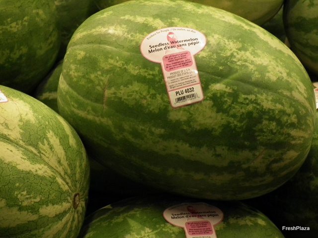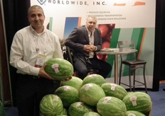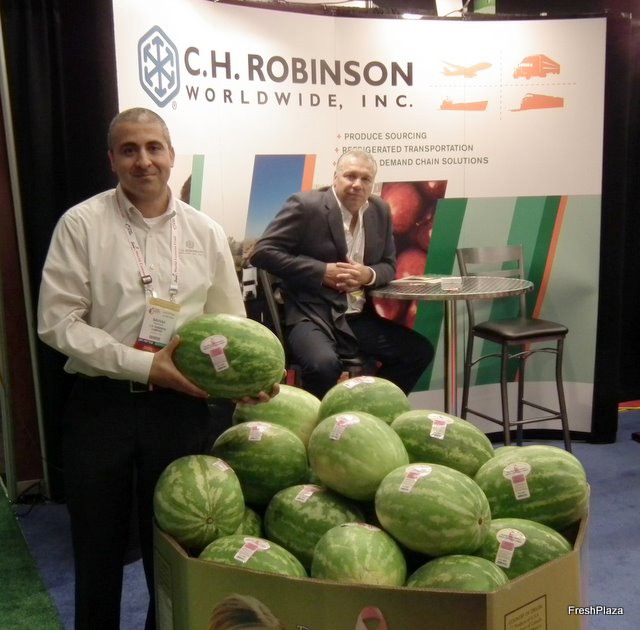 Sav Tsoukalas of C.H. Robinson Worldwide promotes the pink ribbon watermelon. For every bin that is sold, the company donates $2 for breast cancer charity.