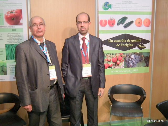 "El Hassane Farahidi and Mohamed Benzine from Etablissement Autonome de Controle et de Coordination des Exportations. They control the quality of Moroccan fruit and vegetables, when its up to standard they provide the "Maroc" label."