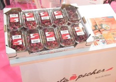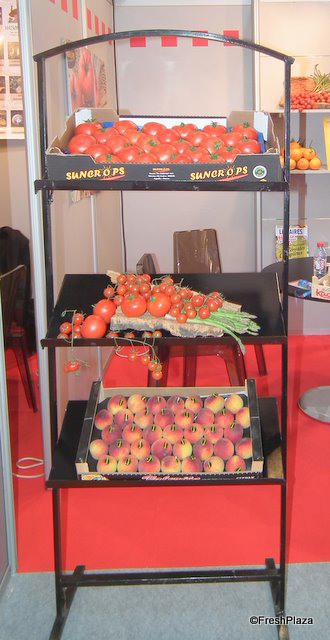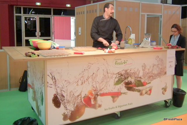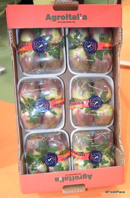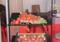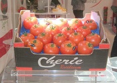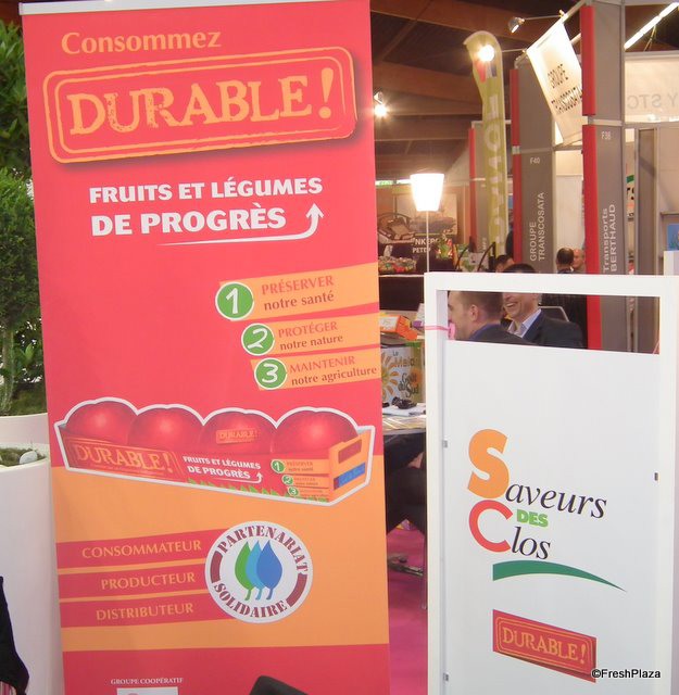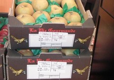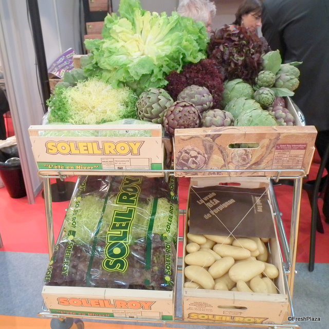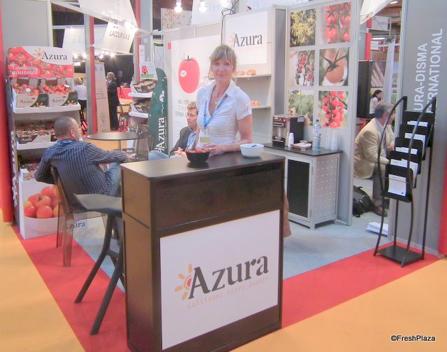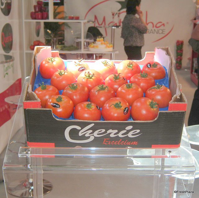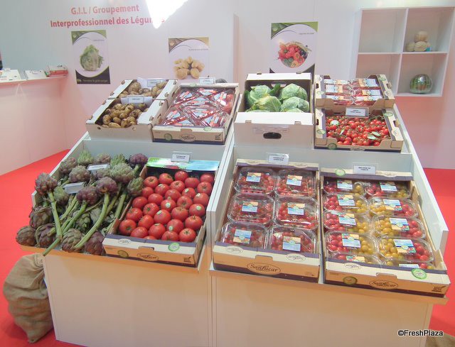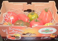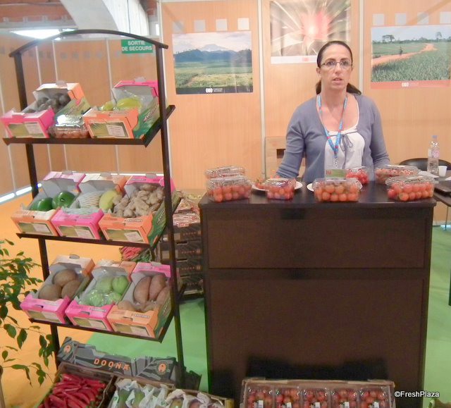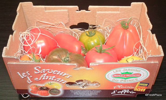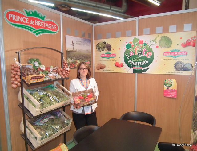 "Marie Dérédec from Prince de Bretagne. The artichoke is already available, because of good weather. Marie holds a new product, a box with different kind of tomatoes, it also cares the label in France: "Saveur de L'annee 2011"."