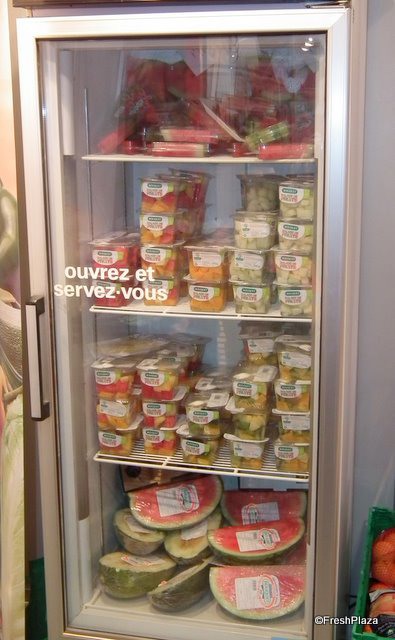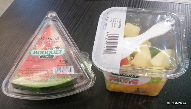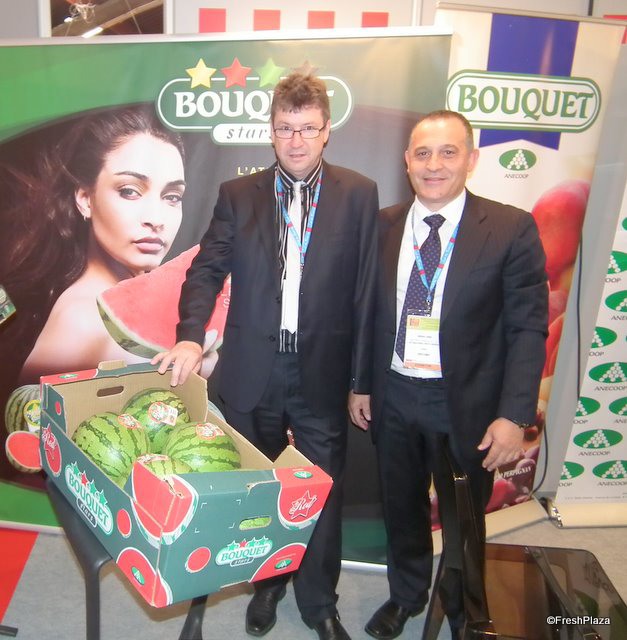 Henri Thorent and Juan Aparisi Server from Anecoop promote the watermelon, which has a new label.