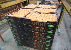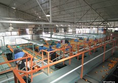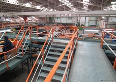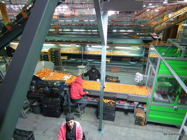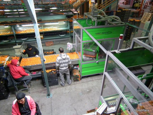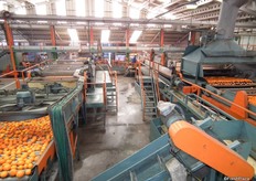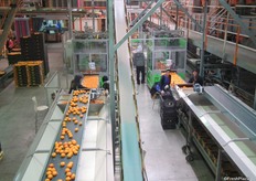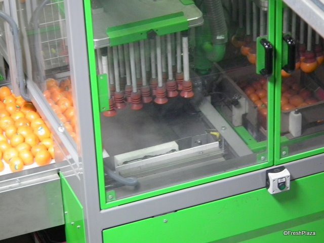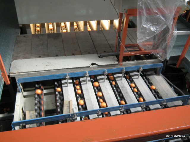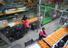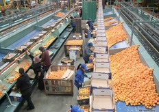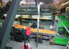 The Or clementines are screened by the machine, where they can see if the fruit from the inside is good as well. poor quality is thrown out and goes to processed industry. The others get a label and will be packed in boxes.