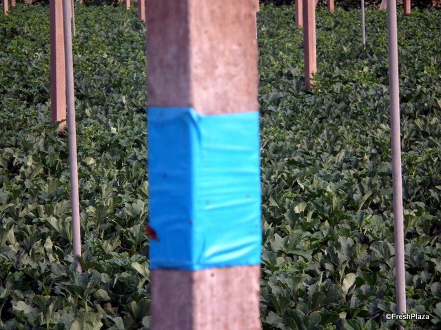 The blue wrap is a thrips trap. There is very little chemical control in use in this cultivation, more biological control is preferred.