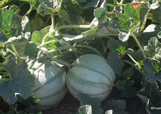 Galia melons under cover. Almost ready for the picking, which is carried out in one swoop.