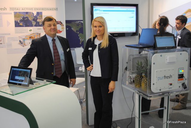 Brian Westcott and Maria Ralph from Purfresh introducing their new product Intellipur provides role-based real-time atmospheric conditions inside the reefer, location data, automatic alerts, and detailed trip report—offering growers, manufacturers, ocean carriers, and retailers the competitive advantage.