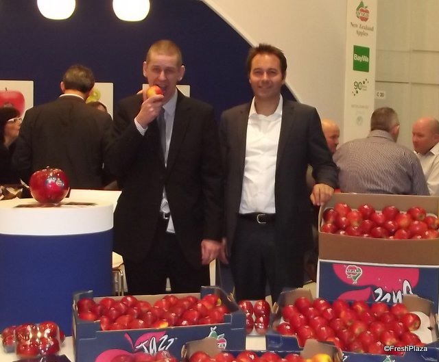 Gary Harrison from Worldwide Fruit and Rosstan Mazey from Turners and Growers enjoying Jazz apples.