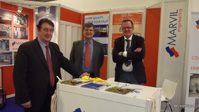 Thibault Marconnet (middle) and Pierre Janny (on the right) from Janny MT. On the left the son of Mr. Janny is in conversation with a potential customer for storage of fresh produce in controlled atmosphere.