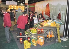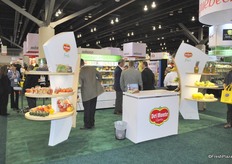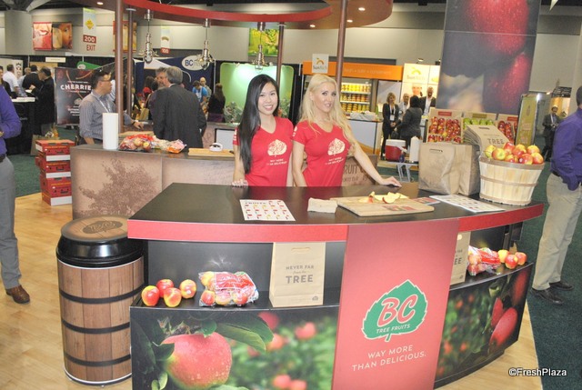 The booth of BC Tree Fruits. They sampled apples and could announce a new variety coming up. The Sailish apple is a bicolor apple a little bit pinkish. It is sweet, high acid, firm apple and a late variety. It is developed through a BC breeding program.
