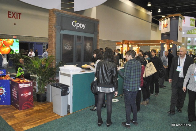 Tim Cavanaugh of FirstFruits Marketing promoting the Opal apple. This third production year they sold 200,000 boxes. They are planning to have more acres and within five years they are aiming at sales of 1,000,000 boxes of apples.
