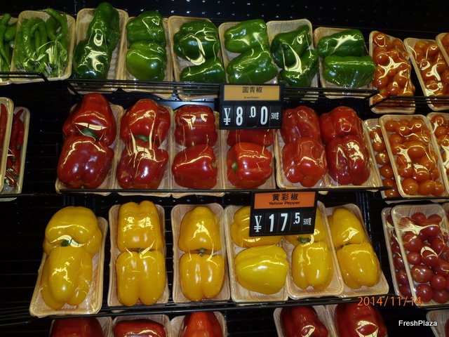Green, red and yellow peppers, big difference in price. Green are just 1 Euro for two while the red are 2.30 Euro.