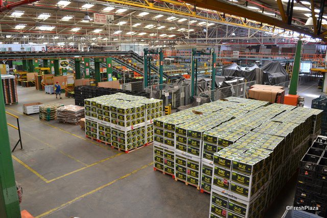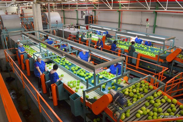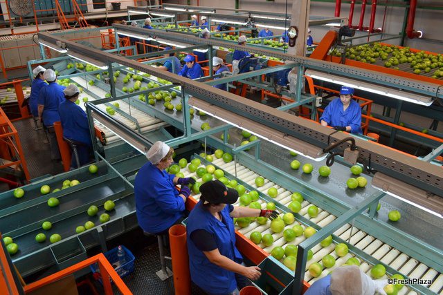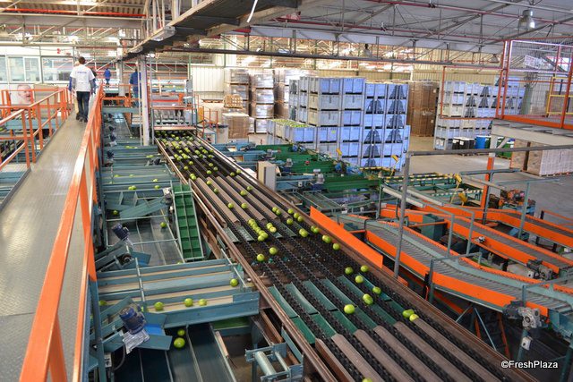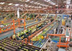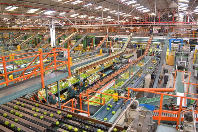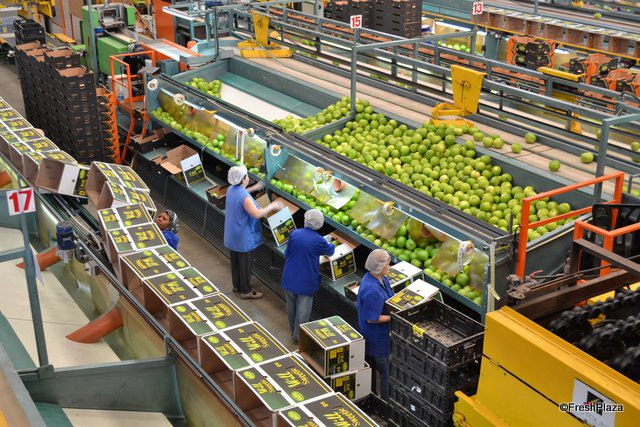 At the moment they pack sweetie uin the packing house. Here the sweeties come in the packing house. They have 2 lines in the packing house.