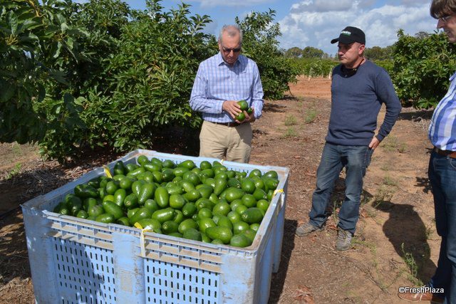 Ramie Hessel looks in an orchard of avocados to the harvested crop.