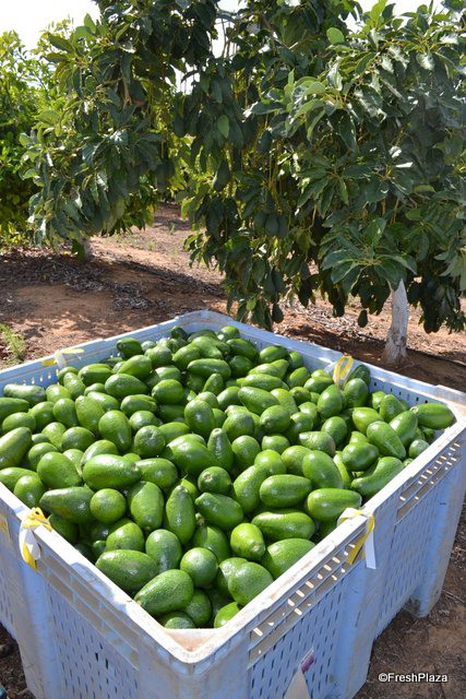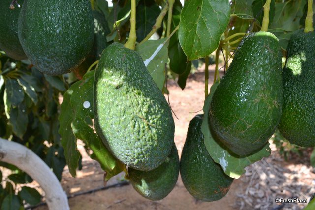 A tree full with avocadoes. The stem of the tree is white, this is to potect the tree against sunburn.