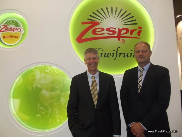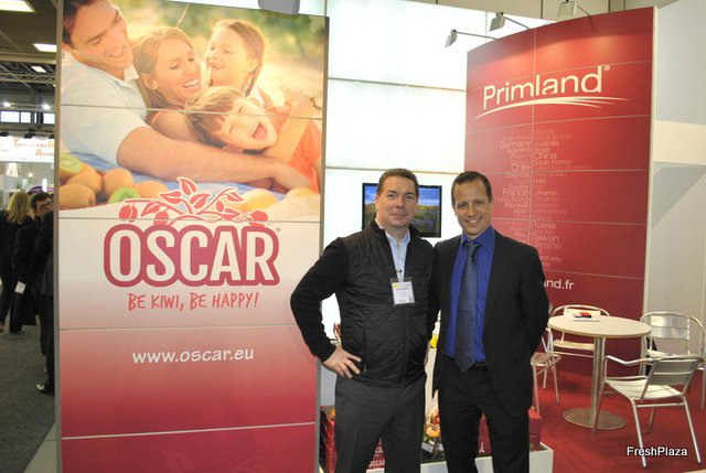 "Guy Milette from Courchesne Larose (Canada, Montréal) and Jean-Baptiste Pinel from Prim'Land both happy about the new Oscar logo and slogan: "Be Kiwi, Be Happy"