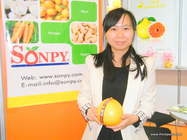 Sales Manager Sunny Chan of Xiamen Sonpy Import and Export; Sonpy has 20 years experience in planting and processing pomelo with 210 acres honey pomelo orchards passing Global GAP certification and guarantee excellent quality products through implementing of strict QC system.