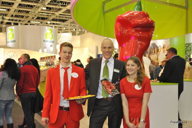 Jan Doldersum promotes with the help of two assistants the new variety Sweet Palermo