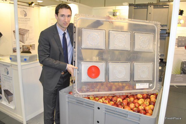 Benoit Janny from Janny MT promote new transparent lids on their bins. It was upon request of the customer, that they could see the product, hat Janny MT made it.