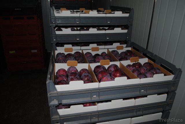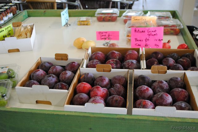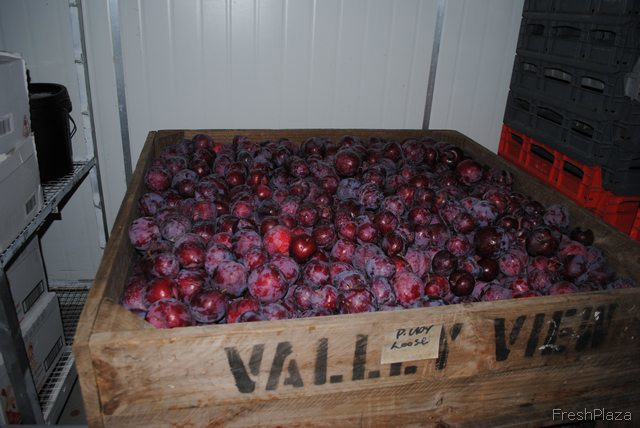 Boxed plums ready to be sold at markets or picked up by visitors.