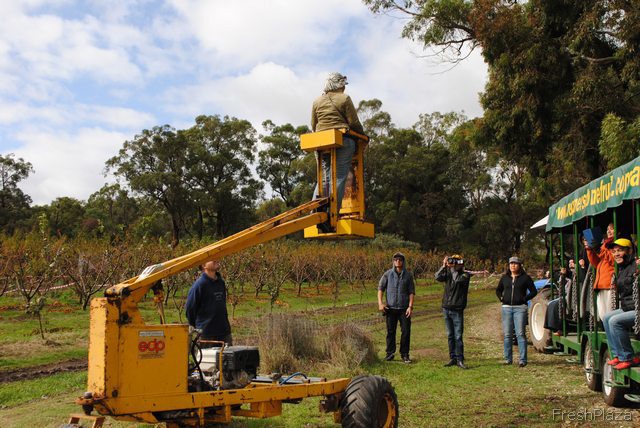 A tourist gets their picture taken on one of the mechanical fruit picking ladders. This is near the end of the tractor ride.