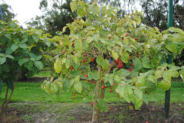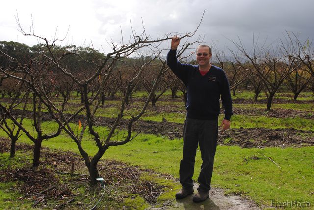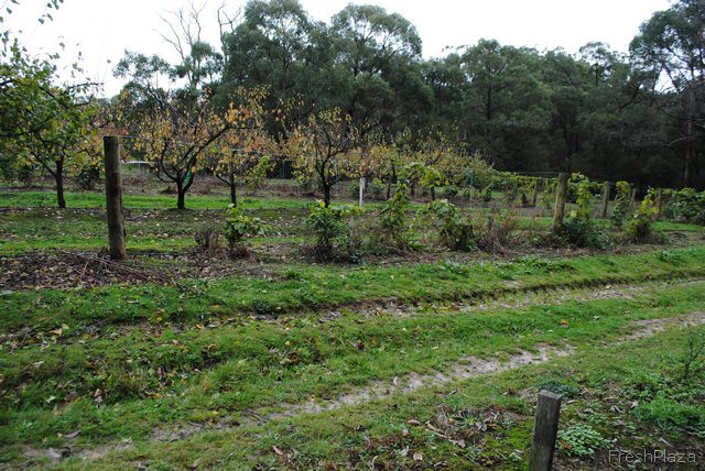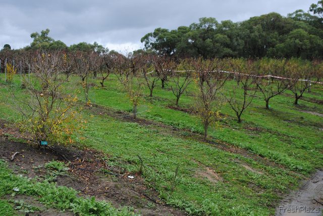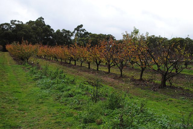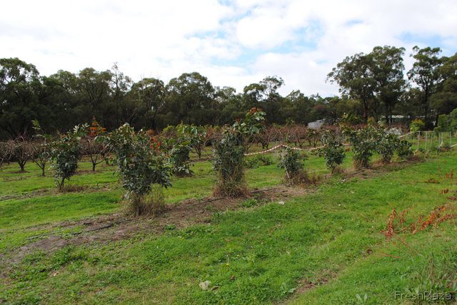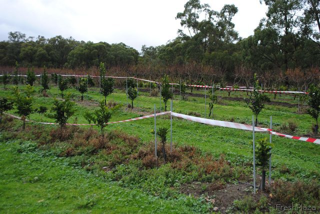 The red and white tape you'll see around many of the rows here is to keep the kangaroos from hopping all over the baby trees. It helps give the fruit a chance to mature. Don't worry, there's still plenty of hopping space left for the kangaroos too.