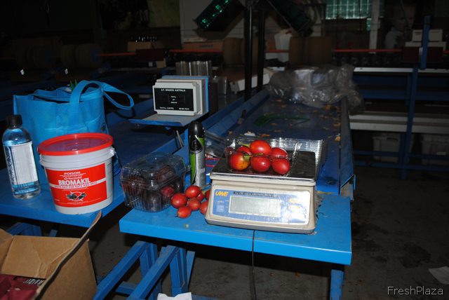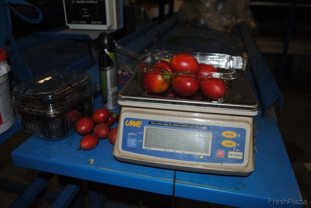 Plump, juicy red tomatillos sitting on the weighing station. Rayners does all the packing and sorting by hand, in house.