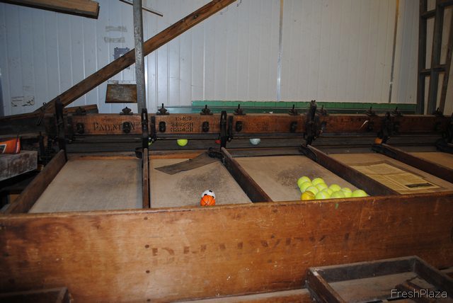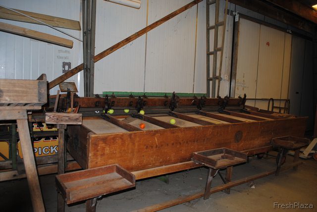 This is also an original grading machine that sorts the fruit according to size. It is cranked by hand, and still works.